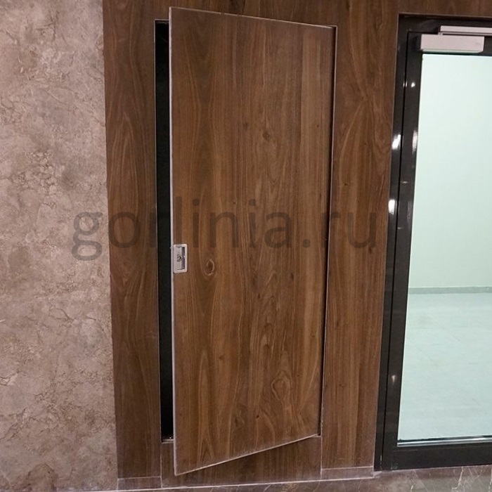 Коробка скрытая с порогом без наличников, створку несут осевые петли на опорных подшипниках. Распахивается на себя. Отделка полотна только с лицевой стороны для ревизионных, технических проемов в ниши и шахты с инженерными системами.